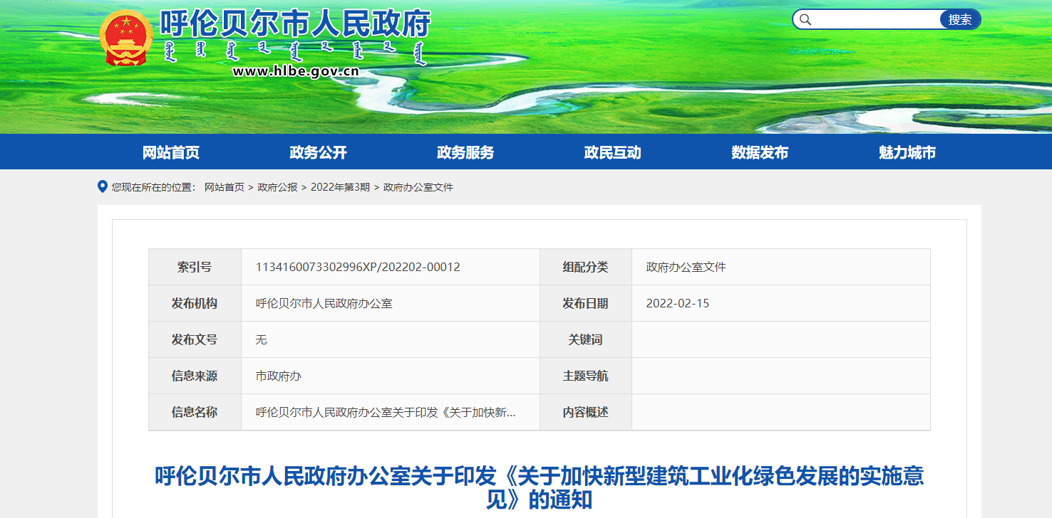 2022年裝配式建筑占比力爭(zhēng)達(dá)到15%,以后逐年提高,到2025年,裝配式建筑面積占比力爭(zhēng)達(dá)到30%。2023年起,新建裝配式建筑要全面實(shí)行裝配式全裝修,到2025年,呼倫貝爾市中心城區(qū)商品房裝配式裝修率力爭(zhēng)達(dá)到30%以上,旗市商品房裝配式裝修率力爭(zhēng)達(dá)到15%以上。